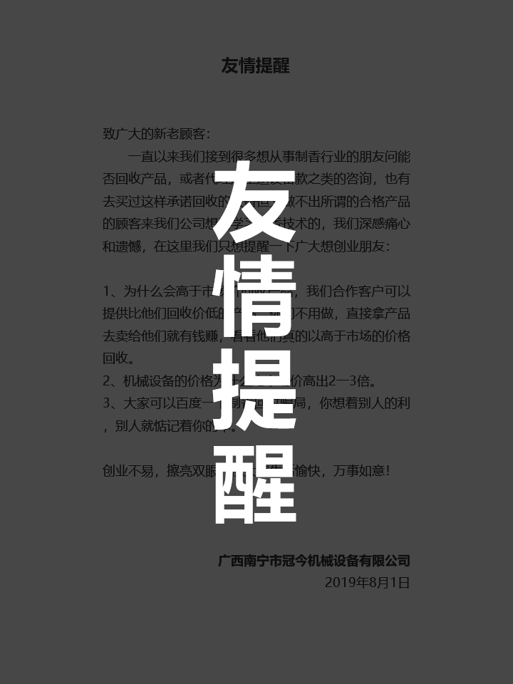 購買冠今制香機(jī),享受八大保證,讓您創(chuàng)業(yè)無憂!冠今制香機(jī)八大支持保證系統(tǒng):強(qiáng)力支持 后顧無憂 1.現(xiàn)場(chǎng)觀摩:免費(fèi)在制香廠里參觀各種香生產(chǎn)流程,滿意后再做決定。 2.專業(yè)培訓(xùn):購制香機(jī)...
